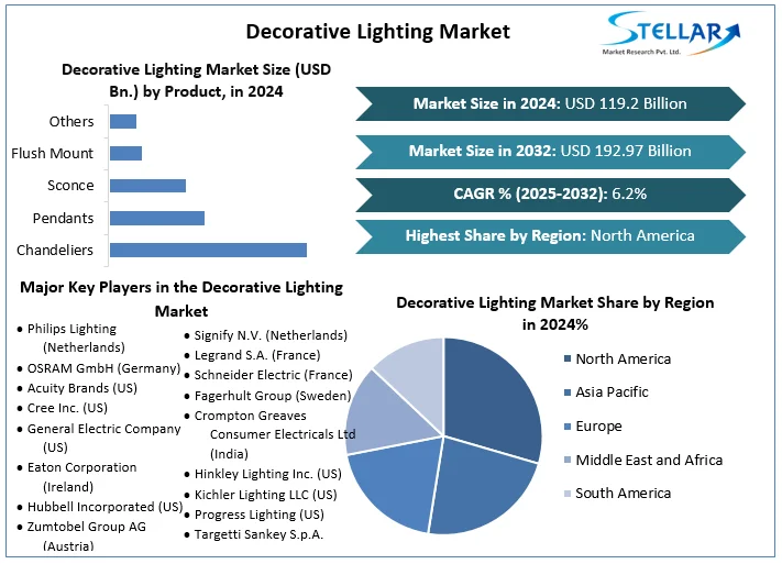 Decorative Lighting Market size was valued at USD 119.2 Bn. in 2024 and the total Global Decorative Lighting Market revenue is expected to grow at a CAGR of 6.2% from 2025 to 2032, reaching nearly USD 192.97 Bn. by 2032.