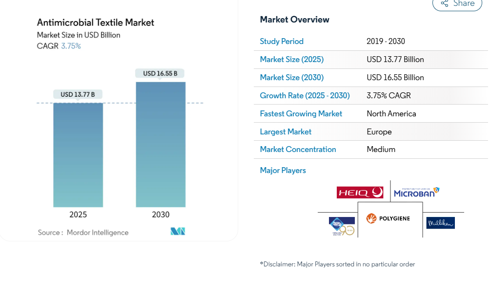 The antimicrobial textile market is now in a mid-maturity phase, shaped by heightened hygiene awareness post‑COVID‑19 and more stringent regulation of active agents across regions