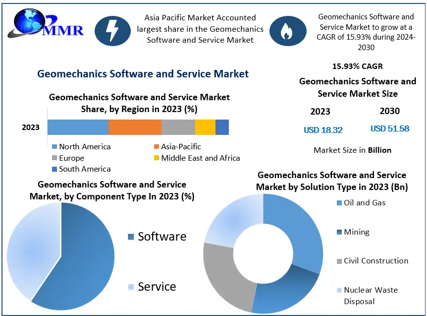 Geomechanics Software and Service Market was valued US$ 18.32 Bn. in 2023 and is estimated to reach US$ 51.58 Bn by 2030 at a CAGR of 15.93%.