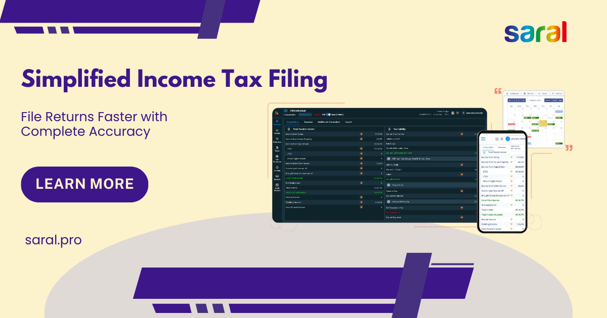 The Fastest Income Tax Filing Software for Accurate ITR E-filing! Stop worrying about making mistakes or missing deadlines during tax season! Saral’s comprehensive Income Tax Filing Software is designed to simplify every step of the ITR submission process for CAs and individual taxpayers across India. Our software handles all types of tax filings, from basic salary returns to complex corporate and trust returns, ensuring you comply with the latest tax laws. You can easily import critical data from sources like Form 16, Form 26AS, and AIS/TIS, letting the software handle complex calculations and identify potential errors before you submit. This powerful tool reduces manual work, maximizes deduction claims, and guarantees a perfect return every time. Choose Saral's reliable income tax filing software to confidently e-file your ITR and make tax compliance simple ("Saral"). Visit: https://saral.pro/income-tax-software/